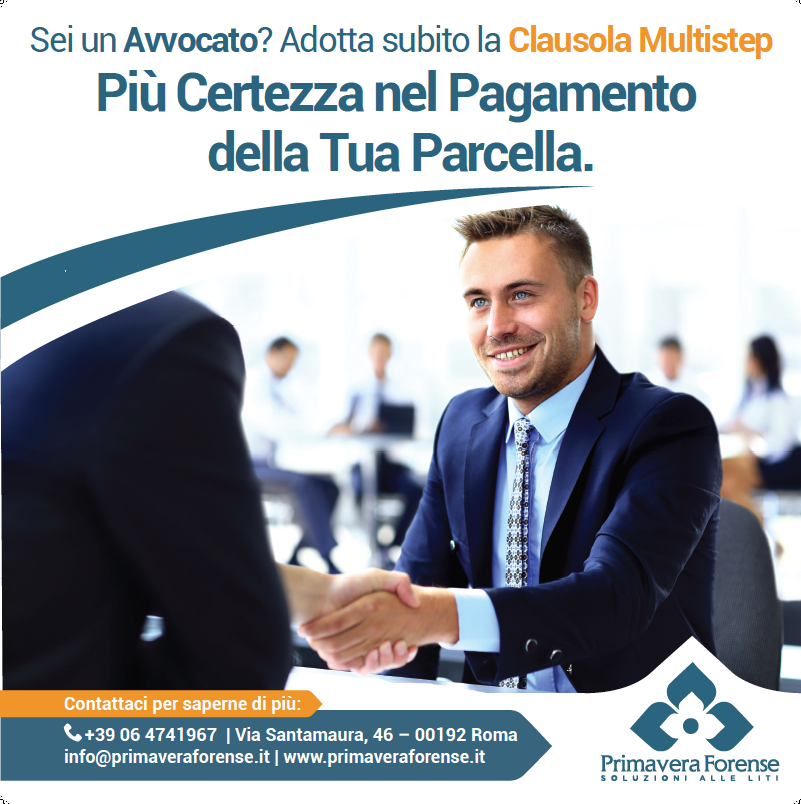 Una soluzione per il pagamento di onorari professionali e crediti d’impresa con l’ottenimento di un titolo esecutivo e definitivo in soli tre mesi grazie alla Clausola Multistep. Clicca qui per leggere tutto l’articolo dell’avv. Giovanni Giangreco Marotta – presidente di Primavera Forense – pubblicato da StudioCataldi.it, quotidiano giuridico.